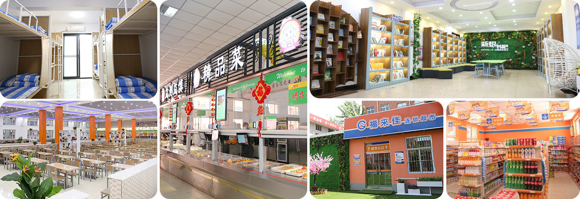 學(xué)校配備帶有獨(dú)立衛(wèi)生間的宿舍、食堂、超市、借閱室,為學(xué)生提供便利校園生活